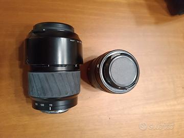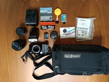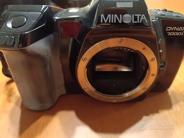 Macchina fotografica della marca Minolta modello Dynax 7000i. Usata con segni di usura dovuti al tempo ed all'uso. Completa di tutti gli accessori tra i quali due obiettivi con diversi focus, la borsa originale, una card per le foto in movimento, il flash ed altro ancora.