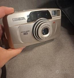 Macchina fotografica compatta Minolta. Obiettivo zoom 38-105mm. Autofocus. Flash integrato. Tracolla inclusa. Una batteria inclusa