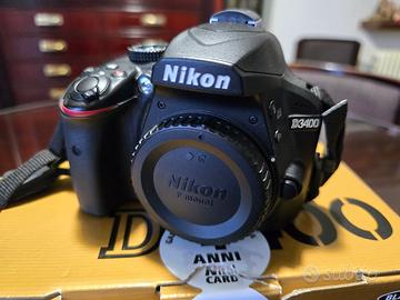 Vendo macchina fotografica Nikon D 3400 con garanzia Nital praticamente nuova con pochi scatti con accessori di corredo cinghia, libretto distruzioni, caricatore batteria,una memoria di 16gb ,2 batterie più vetrino di protezione schermo a euro 400