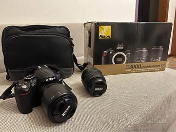 Vendo Nikon d3000 double kit zoom in ottimo stato e usata poco. Completa di borsa e ottica: 1. Af d dx zoom 18-55mm f/3.5-5.6 g ed II 2. Af d dx zoom 55-200mm f/4.-5.6ed Batteria da sostituire. Per info 3202451050.