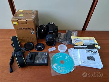 Macchina fotografica Nikon D3300 double zoom vr kit, 2 obiettivi (come si vede nelle foto, il secondo è ancora sigillato nella sua scatola); completa di tutti gli accessori: cavi, caricabatterie, tappi, cinghia, CD-ROM, manuali d'uso in lingua italiana, francese e tedesca, e garanzia. NUOVA E MAI USATA e senza card memoria ma con batteria ricaricabile all'interno; la scatola esterna è un po' rovinata.