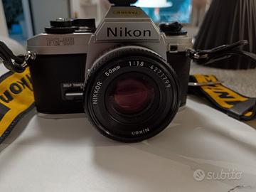 Macchina fotografica Nikon FG-20, ferma da qualche tempo, con flash Kólimat, cinta Nikon e borsa marchiata Cd, obbiettivo Nikon Nikkor 50mm 1:1.8 4271799 con tappo Canon ( presenta una lieve ammaccatura sulla filettatura che però NON compromette il cambio di lente ) , tre lenti : konos 1A SKYLIGHT 52 mm, konos POLARIZER 52 mm e konos CROSS SCREEN 52 mm, con scatola porta lenti. prezzo leggermente trattabile.