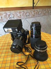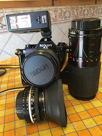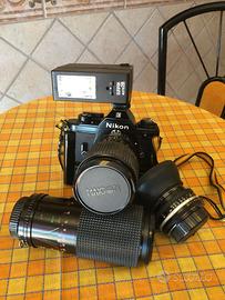 Vendo fotocamera Nikon EM completa di 3 obbiettivi, motorizzata, con flasch e borsa