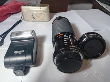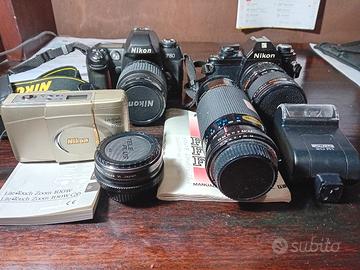 macchine fotografiche analogiche Nikon F80 completa di zoom nikonn29/80+Nikon EM completa di zoom 27/70 kiron(funziona con problemi all'esplosimetro) + teleobiettivo 70/210 Tamron+ compatta Nikon Lite Touche e duplicatore di focale tutto come da foto