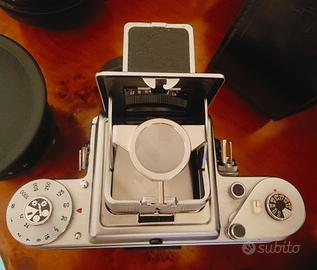 PENTACON SIX TL 1968. Erede dei vari modelli Praktisix,prodotti dal 1957 al 1966(Praktisix 1957/62-Praktisix II 1964-Praktisix IIA 1966)e poi della prima Pentacon Six(1967),la Pentacon Six TL si disingueva dalla sua progenitrice diretta per la possibilita' di utilizzare un pentaprisma esposimetrico TTL,per il resto la macchina e' invariata. Reflex mono ottica medio formato,produce negativi 6x6cm su film in rullo 120 e 220 per rispettivi 12 e 24 fotogrammi. L'ottica è caratterizzata da 4 obiettivi in perfette condizioni intercambiabili (elencati sotto). Il pozzetto per la visione dell'immagine da inquadrare e' provvisto di lente per la messa a fuoco di precisione e di mirino a traguardo per la foto"sportiva " o comunque per inquadrature ad altezza d'uomo (nel ritratto per esempio era buona norma focheggiare a pozzetto e poi inquadrare ad altezza del soggetto per una prospettiva corretta) Otturatore con tendina in stoffa e scorrimento orizzontale con tempi di scatto da 1 secondo ad 1/1000 di secondo piu' posa B per la fotografia notturna, autoscatto meccanico, contapose ad azzeramento automatico all'apertura del dorso.