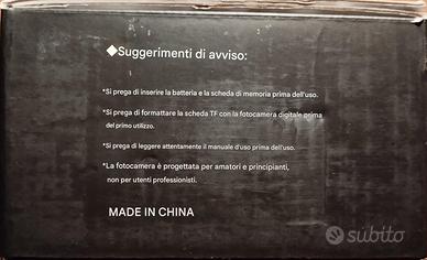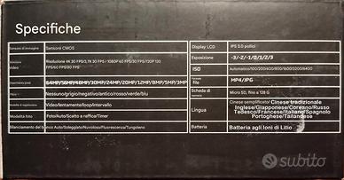La confezione comprende : 1 macchina fotografica come da immagini illustrate + 2 batterie originali, delle quali una estraibile con una pinzetta in metallo a corredo, per via di un modesto inceppamento di una linguetta per l'estrazione tradizionale e la seconda : intonsa. Un pannetto per pulire l'obiettivo ; un cavetto per la ricarica USB_Type-C, che si avvale di caricatore tradizionale per cellulare (non incluso). Il tutto in confezione originale, usato, molto ben tenuto. Le batterie caricano una alla volta all'interno del corpo macchina. E' compresa (già installata una scheda di marchio primario, da 64 GB, già testata per immagini e video). Laccetto celeste per impugnatura di sicurezza o tracolla. Manuale d'istruzioni e guida all'uso, tradotti a colori in italiano ed in Inglese. Visibile a Sassari, in tal caso spedisco senza opzione di reso (sono un privato). In caso di serio interessamento, rilascio un recapito per eventuale assistenza pre-vendita. Comprendo le spese di spedizione nelle Zone nazionali servite dai più noti Corrieri postali.