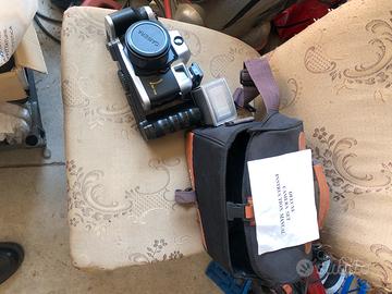 Vecchia macchina fotografica con borsa contenitore. Non so se funziona.