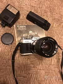 Bellissima macchina fotografica professionale Canon AE-1 completa di Flash e motore per riavvolgimento automatico delle foto e obbiettivo VIVITAR 35-70mm 1:3.5 , 200 M