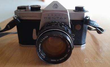 Macchina fotografica reflex degli anni 60 monoculare con esposimetro incorporato, pellicola 35 mm con obiettivo Super Takumar 50 mm f/1.4 con diaframma automatico. La macchina non è testata, nel mirino si vede qualche piccolo granello di polvere che il fotografo mi ha detto che non influiscono nello scatto perché gli specchi sono puliti. Sono inclusi custodia in pelle originale, obiettivo Aus Jena 135 mm, 5 filtri diversi, 1 portafiltri originale COKIN con coperchio, slitta flash originale cromo, 1 paraluce a vite Asahi Pentax 50 mm con custodietta in pelle, set tubi di estensione 11/18/36 mm, manuale d'istruzione, un tele-converter x 2 e una borsa in regalo che non si chiude ma trasportabile con tracolla. Numero di serie 1201015