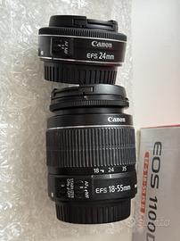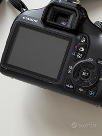 Macchina fotografica Reflex Canon EOS 1100D Completo di: - scatola originale - batteria originale - caricabatterie originale - oculare in silicone originale - cavetto per trasferire da macchina fotografica a computer Il prezzo include: + Corpo Macchina Canon EOS 1100D (Costo originale (350€) + 2 obiettivi: - Canon Obiettivo EF-S 18-55mm f/3.5-5.6 IS II Nero Stabilizzato con MACRO 0.25m/0.8ft (Costo originale 150€) - Canon Obiettivo Pancake EF-S 24 mm F/2.8 STM, Nero/Antracite (Usato pochissimo, costo originale 150€ ) + Borsa professionale Canon Gadget Bag 10EG che può contenere un corpo macchina e due obiettivi. È idrorepellente, ha un'imbottitura completa e divisori interni, rinforzi in pelle, fibbie a sgancio rapido ad alta resistenza, tasche esterne imbottite, maniglia a scatto in pelle e tracolla. (50€ costo originale) Disponibile per consegna a mano su Cosenza Città