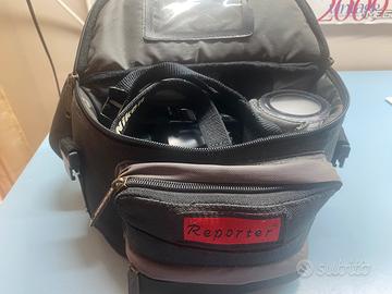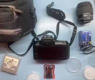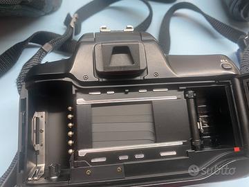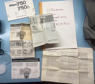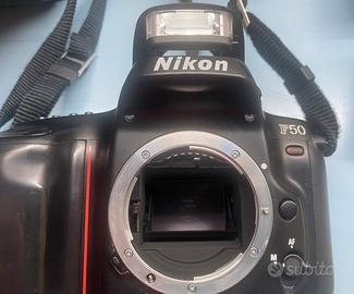 Nikon F50 reflex compatta, con motore e flash incorporati, otturatore da 1/2000 secondo, funzionamento nei modi simple e advanced che permettono sia l’automatismo completo, con quattro programmi di esposizione (istantanee, paesaggi, ritratti e soggetti ravvicinati), sia la regolazione manuale, con priorità del diaframma o della velocità, correzione dell'esposizione, riprese sportive o notturne, controluce, riprese con il diaframma completamente chiuso e la velocità di posa più lenta. Il motore di avanzamento permette il riavvolgimento automatico a fine rullo ed è alimentato da una batteria al litio da 6 volt. Completa fi accessori: obiettivo Nikon 35-80 mm, 2 filtri, libretti istruzioni, borsa reporter. Ottimo stato