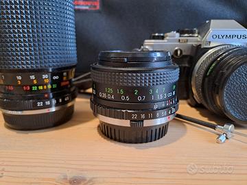 Vendo reflex Olympus OM10, in ottime condizioni. Il set comprende obiettivo 50 mm Zuiko, obiettivo Miranda 28 mm, obiettivo Mitakon 80-200 mm, flash lightblitz 160, cavetto otturatore, cinghia originale Olympus, libretto d'istruzioni e borsa con tracolla. preferisco consegna diretta.