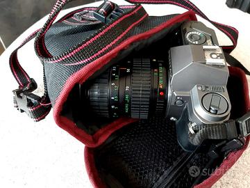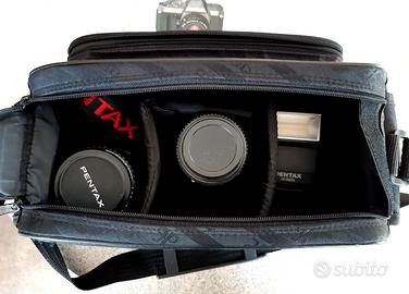 Macchina fotografica Reflex Pentax P30t con obiettivo Pentax, flash Pentax, scatola originale con manuale, borsa e custodia. L'obiettivo 70-120 in foto è stato venduto.