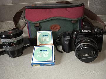 Macchina fotografica reflex Minolta Dinax 500si con borsa, filtri, grandangolo 19-35 mm, teleobiettivo Tamron 100-300 e flash