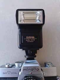 Macchina fotografica reflex vintage Minolta SRT303B, MD Rokkor 50mm 1:1.7, Sunpak auto 222 Thyristor Messa sul mercato dal 1973, è dotata di misurazione TTL e sistema di lettura dell’esposizione a tutta apertura. Dotata di telemetro a immagine divisa e schermo di messa a fuoco. Ha un otturatore sul paino focale e la funzione di autoscatto. È compreso l’obiettivo MD Rokkor 50mm f/1.7 e il Sunpak auto 222 Thyristor