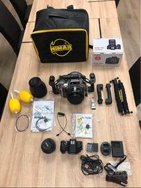 Custodia Nimar completa di impugnatura normale, impugnatura passaggio barca, oblò per 18/55 o macro 60,oblò per macro 100,cavo per flash, supporti per lampade o flash, supporto per gopro , galleggianti , clip di chiusura, o’ring di ricambio, borsa da viaggio.Macchina Reflex Canon EOS 750d, obiettivo ef s 18/55, batterie e carica batterie.