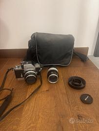 Corpo macchina Nikon F + obbiettivi, un rullino e la borsa originale.