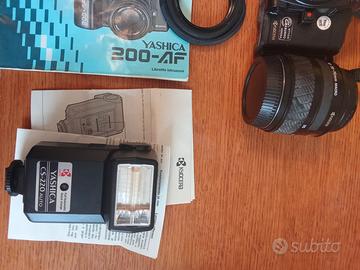 Macchina fotografica Yashica 200-AF, completa di: - obiettivo 35-70mm macro - obiettivo 70-210mm - flash Yashica CS-220 auto (con certificato di garanzia) - borsa imbottita - 2 rullini - 2 porta rullini - paraluce - manuali originali