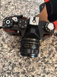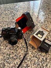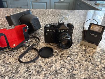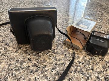 Macchina fotografica anni 80 come nuova con custodia in pelle, obiettivo e flash.