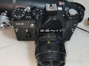 Kit vintage / d'epoca fotosnaiper 12 FS-12 con: macchina fotografica Zenit 12S, obiettivo 58mm 1:2 helios-44M-4 diaframma 2-16, tele obiettivo tair-3s 300mm diaframma 4.5-22, filtri colorati, 1 filtro UV, paraluce, struttura con impugnatura a fucile, fotocamera reflex analogica (a rullino), anni 80', tutto in metallo. Presenta dei piccoli difetti: è da rivedere l'otturatore a tendina in quanto non sempre si chiude correttamente, il tappo per la batteria della fotocamera è mancante, una zampa in gomma della valigetta è mancante, made USSR