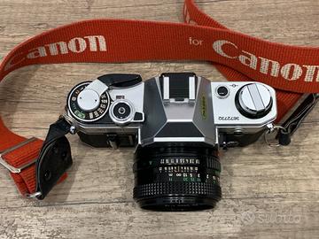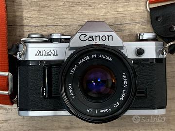 Macchina fotografica analogica Reflex Canon AE-1 perfettamente funzionante il pacchetto comprende corpo macchina con obiettivo 50 mm f/1.8 un grand’angolo 28 mm f/2.8 un obiettivo zoom Tamron 70-210 f/3.8 un duplicatore di focale Kenko 2x attacco Canon con custodia oltre ad un flash a torcia Philips vari filtri per lenti e borsa dedicata Cullmann con scomparti imbottiti