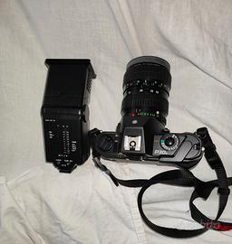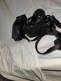 Macchina fotografica Pentax con obiettivo Pentax 28 80 con tappi originali del corpo macchina e dell'obiettivo , coprimirino di protezionee, dovrei avere un filtro polarized nella foto per questo obiettivo tutto quello che era nella confezione originale non è stata più usata da un po' ma è stata fermata perfettamente e ottimamente funzionante più vendo insieme un flash Pentax con modalità program automatica e manuale completamente dedicato a questa macchina che imposta anche da solo il diaframma.