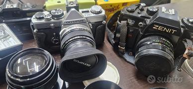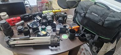 N.10 macchine fotografiche. 1 Zenit 122 1 Olympus OM 2 1 Canon power S5ÌS 9 Obbiettivi e tele 1 Borsone 1 treppiede 2 Flash