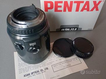 Ottica completa degli imballi originali, i suoi tappi e la custodia morbida in scamosciato. Mod. 28930; angolo di campo su 24x36: 24° in diagonale, 20° in orizzontale. Interamente metallico nella meccanica e nella finitura esterna. Abbastanza compatto (a infinito 74 x 104 mm), peso imponente di 600 grammi, fuoco diretto continuo da infinito a 1:1 (31 cm dal soggetto al piano pellicola/sensore). Schema ottico a 9 lenti in 8 gruppi; resa ottica altissima in termini assoluti, distorsione da record -0,0193%; soddisfa le pellicole più esigenti alle più basse sensibilità e sviluppate coi rivelatori ad alta acutanza. Le sue prestazioni in termini di risolvenza, contrasto, resa cromatica, profondità delle ombre e plasticità sono particolarmente apprezzati anche AL DI FUORI dell'utilizzo in macrofotografia, E' stato giudicato adeguato a soddisfare il sensore della FF Pentax K1 con pixel shifting (che su cavalletto, quando attivato permette 36 Mp effettivi senza interpolazione su tutti e tre i colori della matrice di Bayer = equivalente a una resa di un sensore FF normale da oltre 50 Mp).