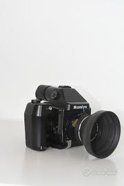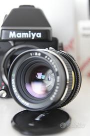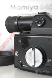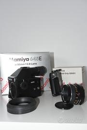 Mamiya 645E con obiettivo 80 mm F2.8 + grip originale. Tutto funziona. Esposimetro, doppia esposizione e sollevamento specchio funzionano perfettamente. obiettivo pulito con paraluce originale.