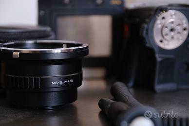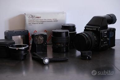 Vendo in blocco Mamiya 645 pro in ottimo stato con 80mm macro f 1.4, 45mm f 2.8, 150mm f 4. Anello adattatore per micro 4:3. Due caricatori 120mm originali, più un dorso polaroid HP401. Power grip WG402 Pro, cavo per scatto remoto. Tutte le batterie all'interno sono nuove. Occhiello prisma intatto ma rovinato sui bordi, nulla di compromettente.