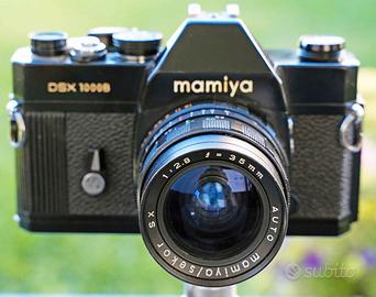 Mgnifica reflex meccanica Mamiya DSX 1000 B in esecuzione nera con un bellissimo obiettivo originale 35mm 2,8. Da ricordare che la Mamiya DSX con i suoi obiettivi SX consente la lettura dell'esposimetro a tutt'apertura, rarissimo nelle macchine con innesto a vite M42. Ricordo che l'obiettivo 35mm é isentico a quello della Roleiflex SL come costruzione ottica. La reflex é funzionante in turro e consente la lettura della esposizione nel modo Spo e integrato.