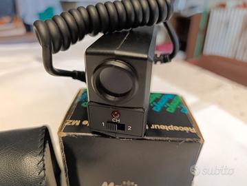 ricevitore elettronicodotato di un selettore di canali ("CH 1 - 2") e un cavo a spirale per il collegamento alla fotocamera o al flash.
