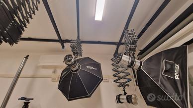 MANFROTTO Top System SKY TRACK - Sistema aereo per flash da studio fotografico professionale, sistema pari al nuovo, usato a livello amatoriale. Con 4 rotaie da 3.20m, scorrevoli su due rotaie da 5 metri; è possibile creare moltissimi set fotografici senza ingombro di cavi e stativi, installazione semplice con stop da 6/8 sul solaio, qualità e sicurezza Manfrotto,