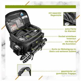 •disposizione scomparto interno variabile, ad esempio 2 involucri reflex, 2 lenti, 2 flash e tanti accessori •opzioni di archiviazione versatili nel tasche interne ed esterne e scomparti (ad esempio, 1 tasca frontale, 1 tasca posteriore, 2 tasche filtro) •6 divisori inclusi con comoda copertura parapioggia •Volume di fornitura: sacchetto foto tipologia 'New York' •Dimensioni interne (lunghezza x larghezza x altezza) ca. 40x20x20cm