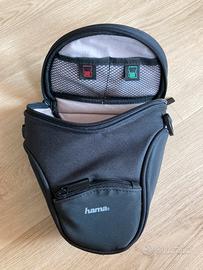 Custodia porta macchina fotografica per marsupio Hama. Ampio scomparto interno imbottito con due retine porta schedine e taschina esterna. Misure: cm 18 larghezza per cm 21 altezza, profondità cm 9,5. Larghezza nel punto basso più stretto cm 9. Condizioni perfette.