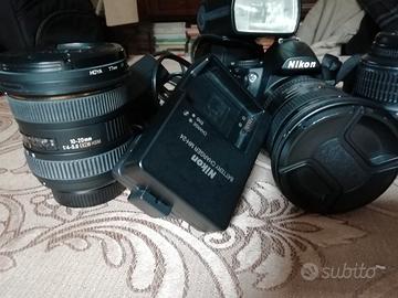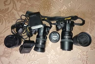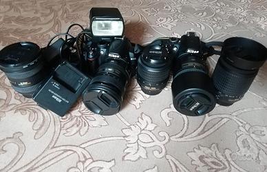 Cedo in blocco il seguente materiale Nikon: Nikon D3000 con caricabatteria, batteria originale + batteria compatibile e tracolla - 8.500 scatti. Buone condizioni; Nikon D3200, con caricabatteria, batteria originale + 2 batterie compatibili nuove e tracolla - 3.000 scatti. Buone condizioni, ma con flash pop-up non funzionante; Obiettivo Nikon AF 18-55mm. VR DX f. 3.5-5.6 G, buone condizioni. AF a volte incerto con poca luce; Obiettivo Nikon AF 55-200 mm. VR DX f. 4.0-5.6 G con paraluce. Buone condizioni. Stabilizzatore a volte incerto. Obiettivo Nikon AF 18-200 mm. VR DX f. 3.5.5.6 G II. Buone condizioni, perfettamente funzionante, con vernice delle indicazioni sul barilotto leggermente consunte. Anello adattatore per filtri da 72 mm. bloccato (non riesco a svitarlo, ma comunque funziona da paraluce); Obiettivo AF Nikon 55-300 mm. VR DX f. 4.5-5.6, buone condizioni, con imballo e paraluce; Obiettivo Sigma AF 10-20 mm. DC HSM, buone condizioni con tappi; Flash a slitta AF TTL Yongnuo Speedlite YN560-II, buone condizioni. Tutti gli obiettivi hanno i tappi, alcuni originali, altri di terze parti. Preferito scambio a mano per mostrare le effettive buone condizioni di uso e la funzionalità del materiale ma posso anche spedire col servizio TuttoSubito.