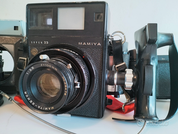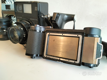 corredo completo; 2 corpi, 2 dorsi uno 6x9 uno 6x7, 2 impugnature, 2 obiettivi standard 100mm e grandangolo con mirino dedicato, solo in blocco, spese di spedizione a carico dell'acquirente.