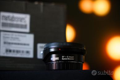 Vendo per inutilizzo anello adattatore Metabones Speedbooster per lenti Canon su corpo macchina Sony. L'anello ha una lente che permette di portare le ottiche Canon su Sony senza incorrere nel fattore di crop.