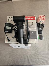 Metz 76 MZ5 con batteria, scatola, istruzioni e adattatore sca 3083 per attacco ad apparecchi Nikon digitali. ASSOLUTAMENTE TUTTO MAI USATO.