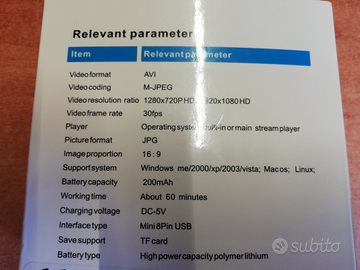 Vendo n. 2 micro telecamere utilizzabili per videosorveglianza o sport. Dimensioni 2x2x2 cm. Possibilità di scattare foto, fissaggio tramite pinza a molla oppure supporto da avvitare.