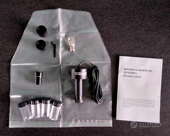 Nuovo in confezione originale, aperto solo per fare le foto. In robusto metallo, testa rotante, illuminatore a 230 Volt con spina europea, condensatore regolabile. Obiettivi 4/0.10, 10/0.25, 40/0.65, e 100/1.25 (olio). Oculari WF10x e WF16x. Messa a fuoco macro e micrometrica. Telecamera digitale USB per collegamento a computer. Corredato da copertina antipolvere, 2 inserti, chiavetta, 4 fiale e manuale istruzioni. Peso 3,6 kg.