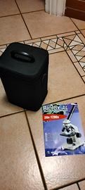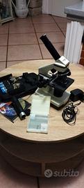 microscopio Bresser come nuovo tre obiettivi Acro due oculari telecamera USB due modalità di illuminazione tavolino traslatore vetrini strumenti da taglio e dissezione valigetta per il trasporto