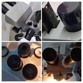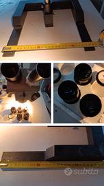 microscopio manuale usato semiprofessionale con faretto laterale. Regolazione tramite manopola per l'ingrandimento e manopola per l'altezza, circa 25 cm dalla base. Le lenti sono intercambiabili da 14 X e 8 X / 23 , faccio presente che la lente lato D X è stata fissata con silicone ma funziona la sx con regolazione diottrie. Ottimo per vari usi ove richiesto un buon ingrandimento. Il faretto è alimentato a 12 v tramite trasformatore montato sopra.