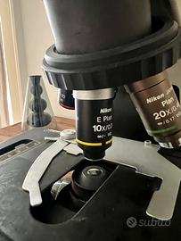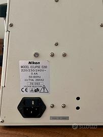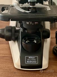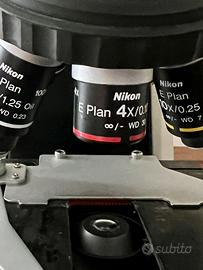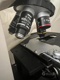 Microscopio Nikon E 200 con ottiche 4x, 10x, 20x, 40x, 100x oil.
