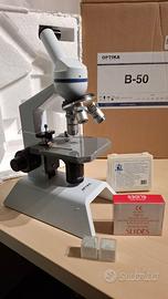 OPTIKA Microscopio biologico monoculare B-50. Imballaggio e confezione originali, ideale per un intelligente regalo. Compreso di vari tipi di vetrini, confezioni nuove.