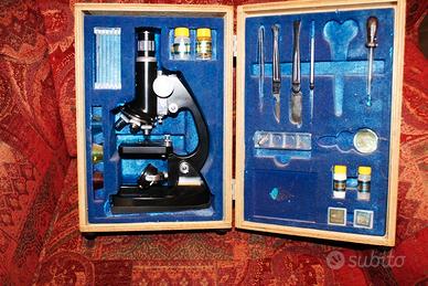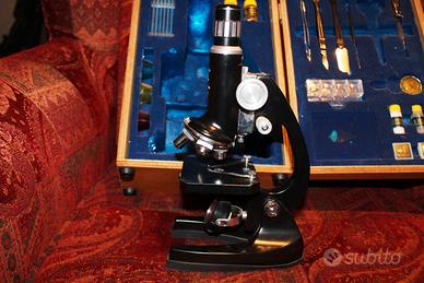 Molto bello; microscopio vintage tutto in metallo completo di scatola in legno e accessori.