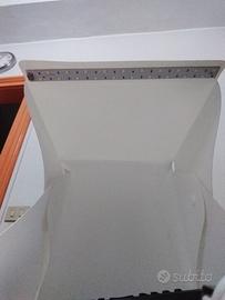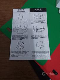 Mini set fotografico portatile. Il set è composto da contenitore dotato di luce (spina usb), 4 sfondi: bianco, nero, rosso e verde. Borsa e istruzioni. Mai utilizzato. Misure 23×23×23 cm