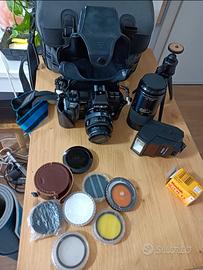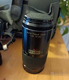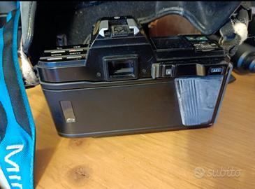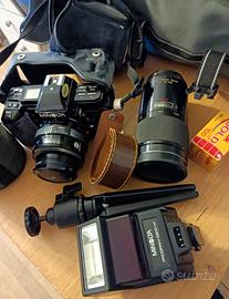 macchina fotografica analogica ,Minolta 7000 35 mm con istruzioni, flash, cavalletto, 2 obiettivi, borsone, varie lenti,1.rullino.. tutto come da foto.