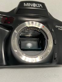 Fotocamera Minolta Dynax 7xi reflex analogica 35mm. Buone condizioni, l’ottica del mirino è in buono stato. Tutte le funzioni come l’otturatore, l’esposimetro e la messa a fuoco automatica funzionano perfettamente; la fotocamera è stata testata con rullino e caricamento, avanzamento e riavvolgimento automatico funzionano perfettamente, i led estero ed interno funzionano senza problemi. Il FLASH funziona solo nella posizione “flash TTL” e NON FUNZIONA nelle posizioni “flash automatico” e “flash automatico con prelampi”. La fotocamera è dotata di un obiettivo luminoso Minolta 28-105mm f 3.5/4.5 xi dotato di zoom motorizzato, dei tappi della fotocamera e dell’obiettivo e di una tracolla. L’obiettivo è in buone condizioni, funzionante con diaframma pulito e lenti senza funghi e graffi. Disponibile all’invio di altre immagini.