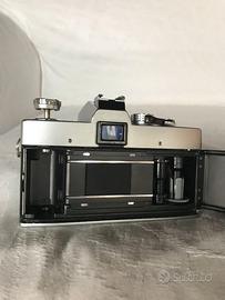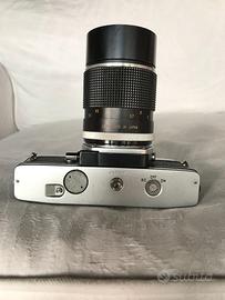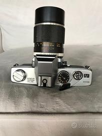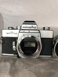 Fotocamera reflex Minolta SRT102 con obiettivo Panagor. Entrambi in condizioni molto buone, la macchina scatta correttamente su tutti i tempi, l'esposimetro reagisce, ma richiede batterie da 1,35V. Guarnizioni paraluce sostituite.